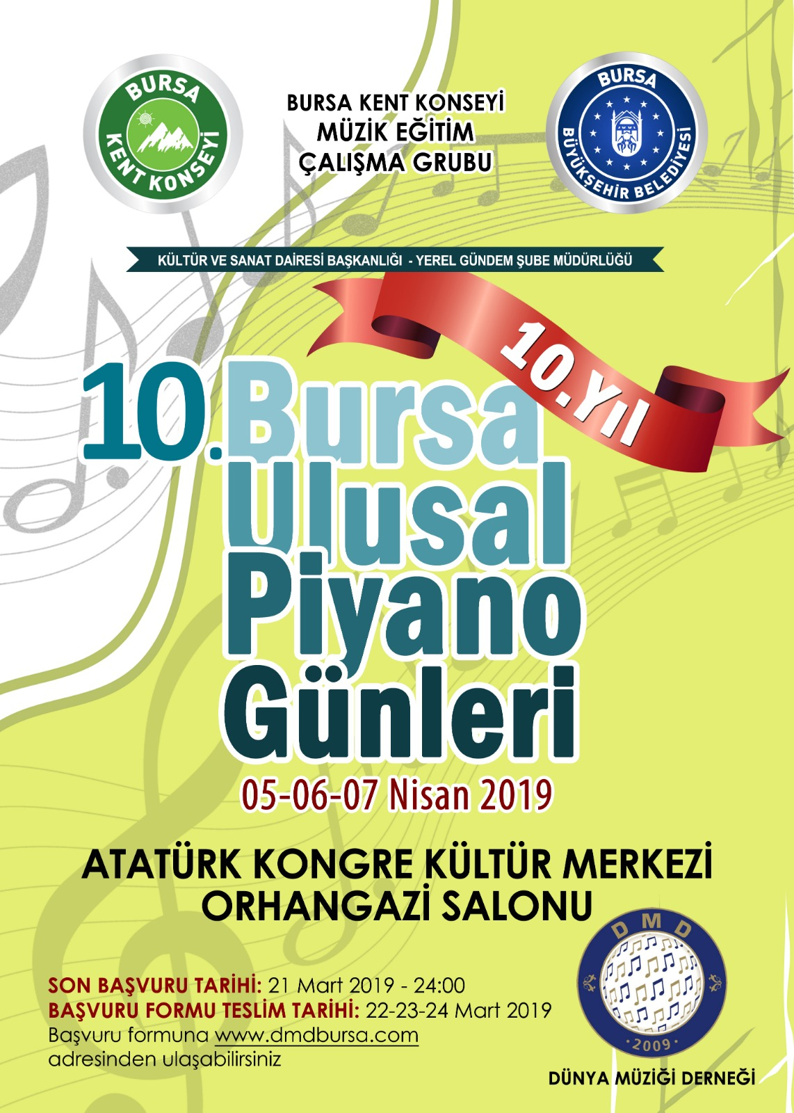 Bursa Kent Konseyi Müzik Eğitim Çalışma Grubu ve Dünya Müziği Derneği'nin katkılarıyla düzenlenen 10.Ulusal Piyano Günleri programı 05-06-07 Nisan 2019 tarihlerinde olmak üzere üç gün süresince Merinos AKKM Osmangazi Salonunda gerçekleştirilecektir. Tüm halkımız davetlidir.